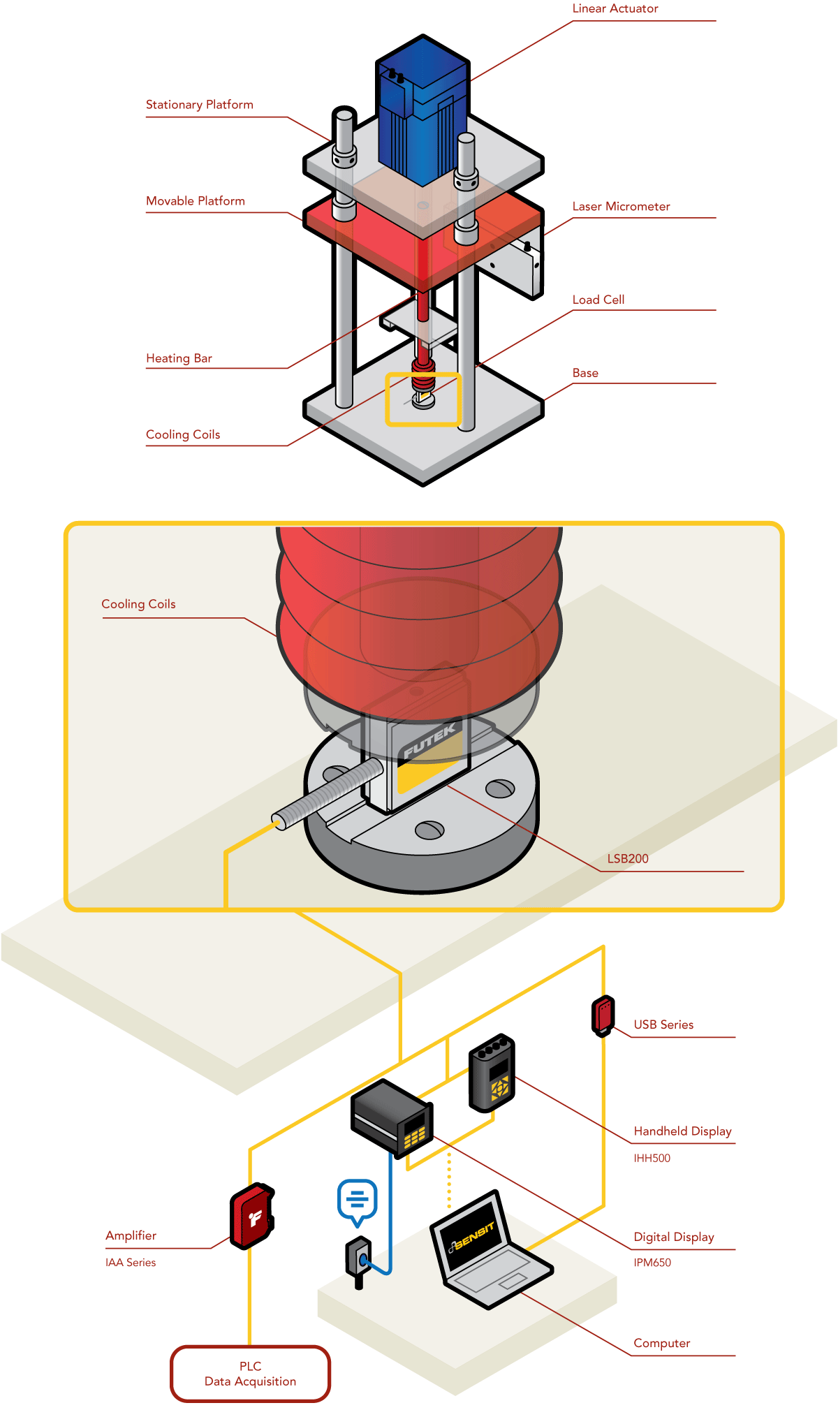 2、FUTEK LSB200微型S型传感器安装在测力台架的底部,正对着加热棒和冷却盘管下方。LSB200传感器特殊的设计,使得传感器在台架加热和冷却降温的过程中,测试结果不受影响。