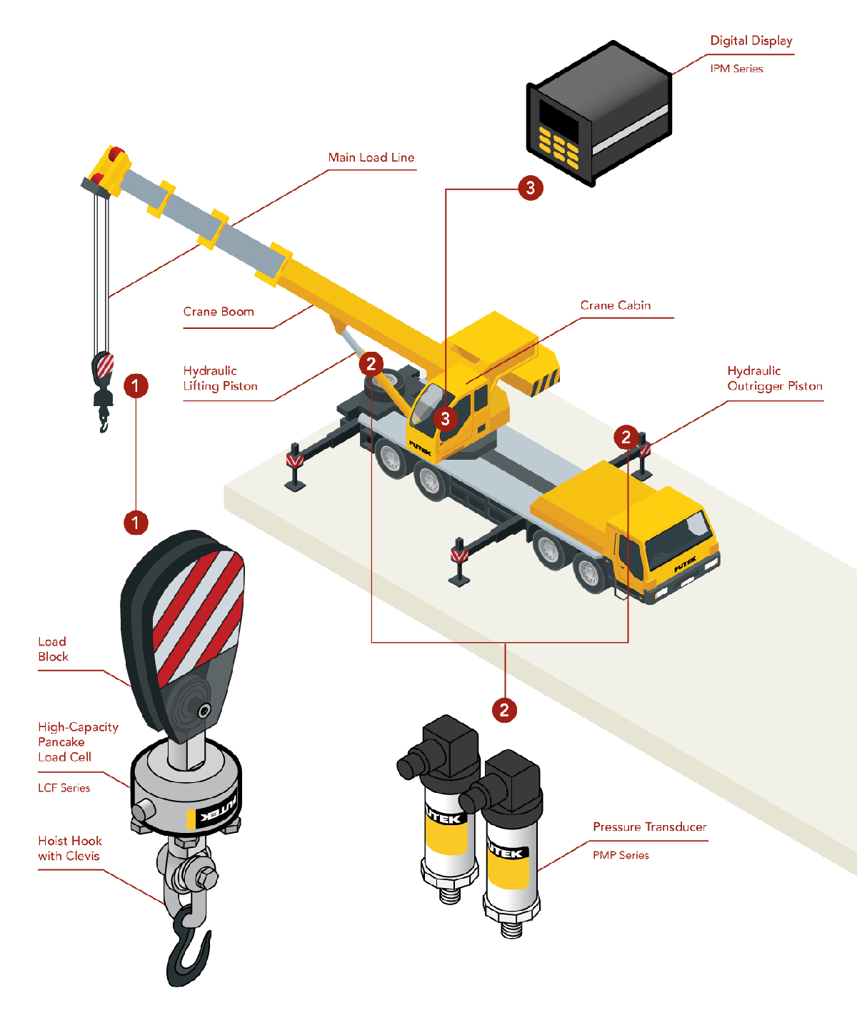 1、FUTEK 的 LCF 系列饼状力传感器安装在负载块和起重钩之间,以测量起重机提升的负载。此外,在起重机液压系统中还安装了 PMP 压力传感器,以测量液压提升活塞和外力活塞的压力。