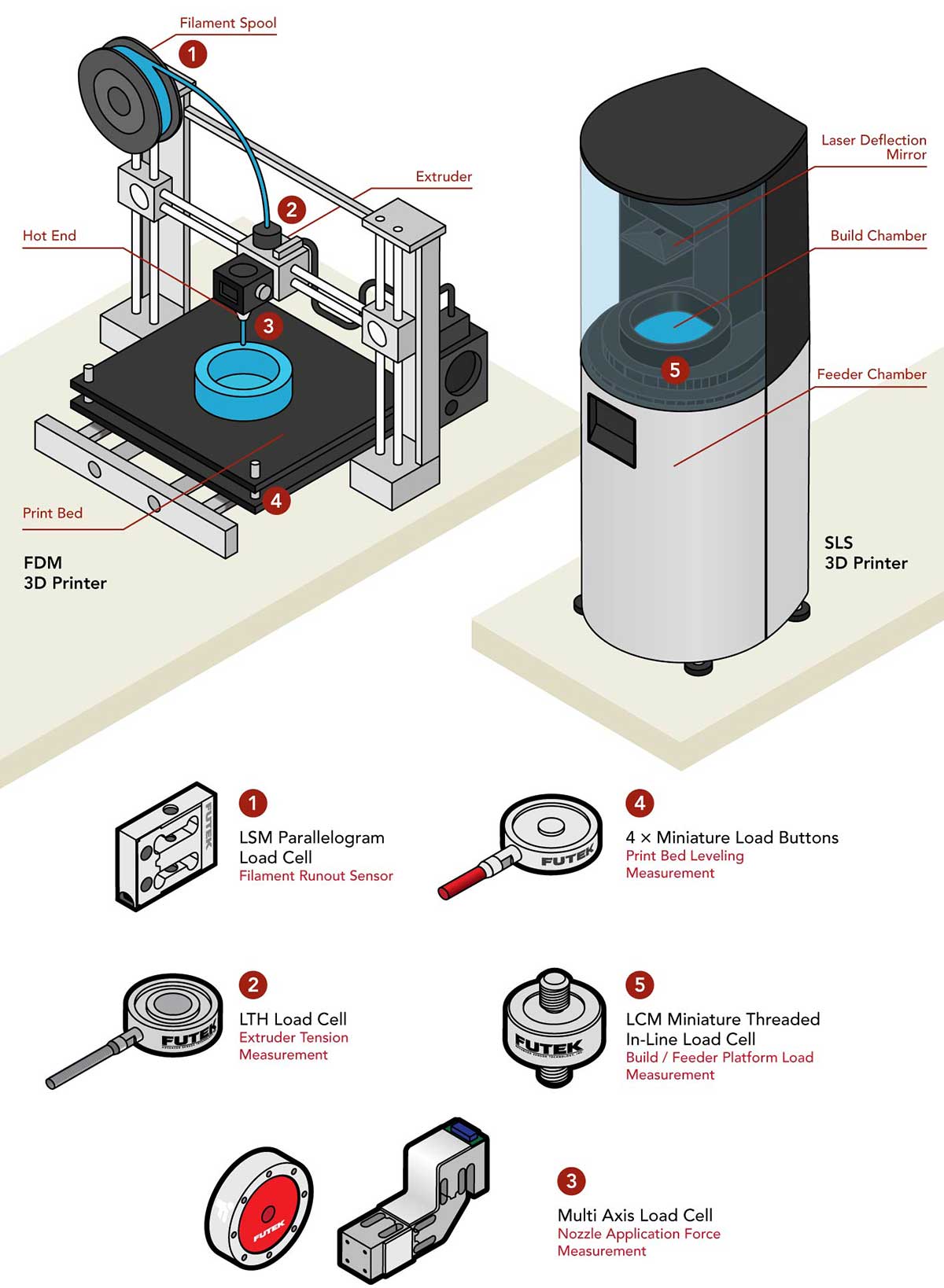 5、构建/喂料机平台重量测量:在SLS 3D打印中,构建平台通常使用活塞向下移动,而粉末进料斗使用单独的活塞向上移动。通过将称重传感器集成到这些活塞中,可以实时监控施加到构建平台和粉末进料斗的压力。称重传感器提供有关施加到构建平台的压力均匀性的信息,允许实时调整以确保一致、高质量的打印。此外,称重传感器可用于监控粉末进料斗的重量,确保料斗充满足够的粉末以供下一次打印,并防止料斗在打印过程中空载。