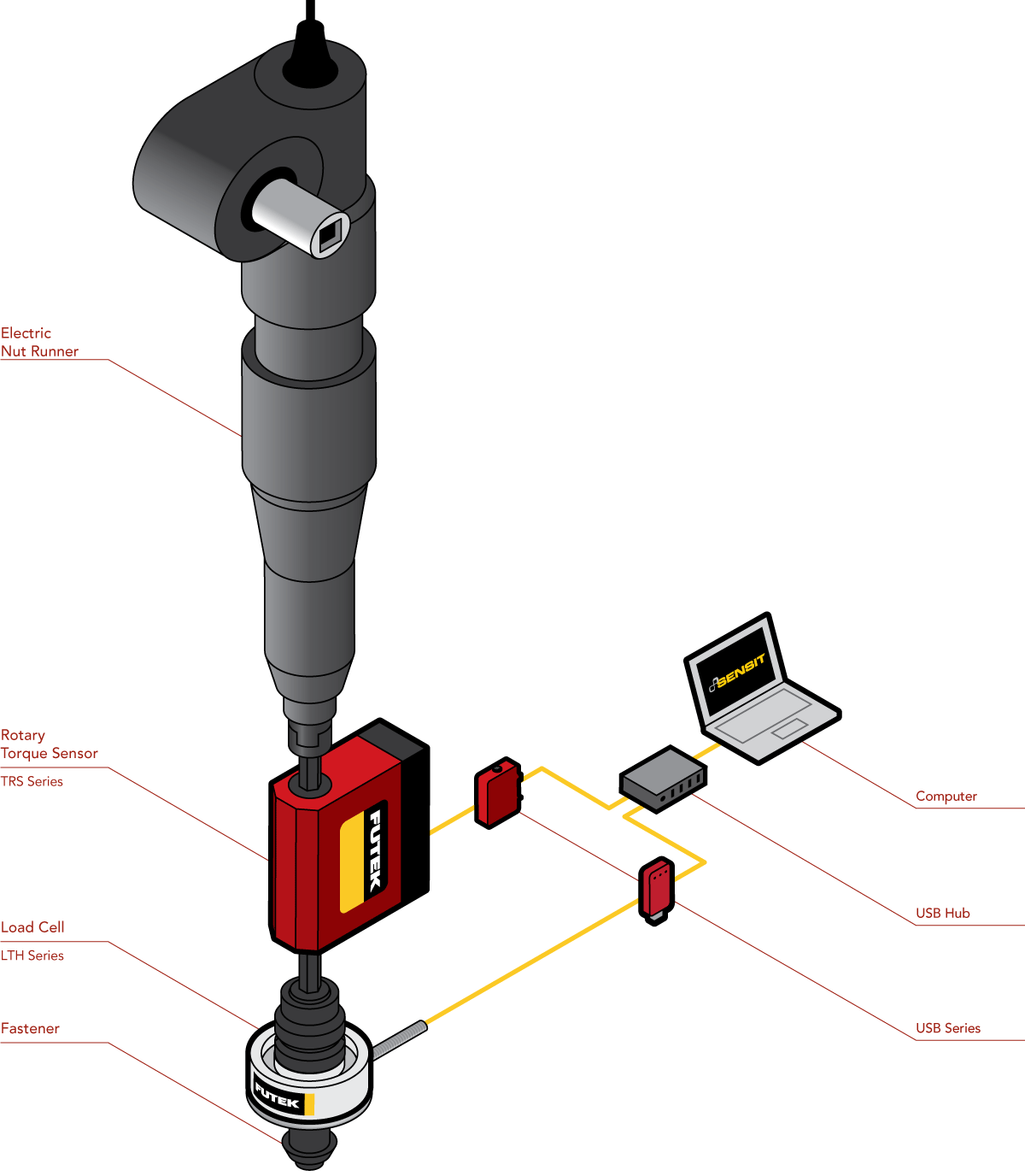 中空型力传感器(LTH系列)、动态扭矩传感器,及与之配套使用的FUTEK USB采集方案、SENSIT软件。