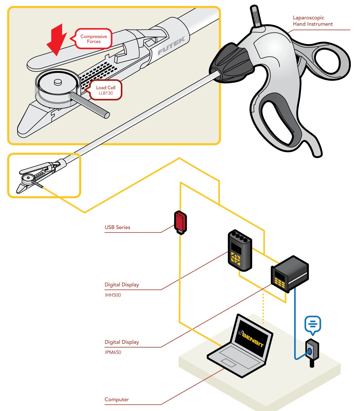 2、在这个应用中,FUTEK 的微型按钮型力传感器(LLB130)安装在腹腔镜手器械的抓取端。测力元件记录力测量值,可用于校准工具。