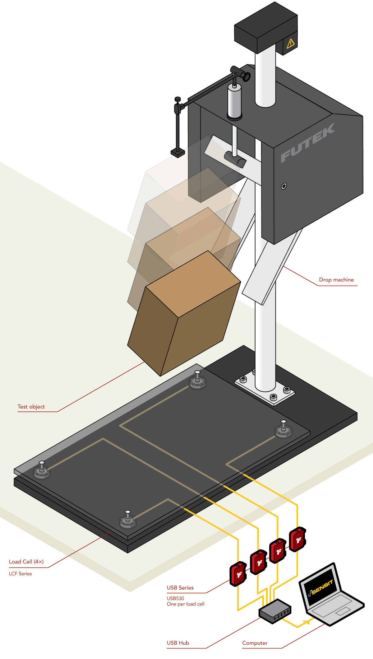 1、4 个 LCF 系列拉压力传感器安装在跌落试验机底座的四个角上。然后将测试平台固定在四个测压元件上。