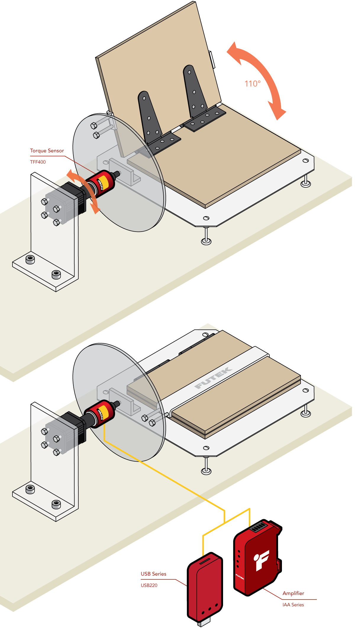 FUTEK的TFF400静态扭矩传感器,搭配仪器(USB220采集模块,IAA系列放大器)。为了更深入地分析铰链性能,可以使用一个内置编码器的旋转扭矩传感器TRS605和一个USB520。
