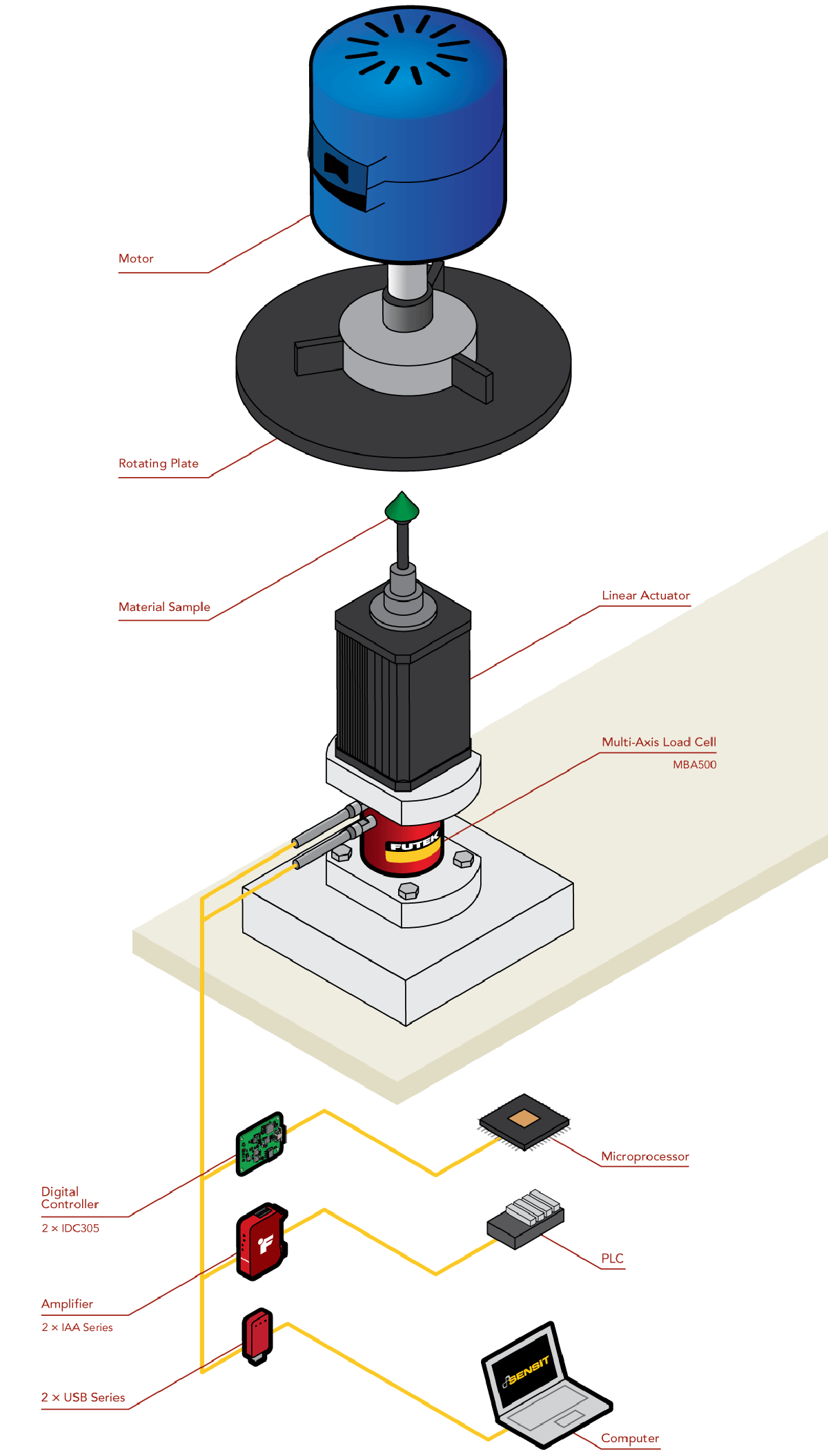 1、测试样品附着在MBA500多轴力传感器上与线性制动器配对。