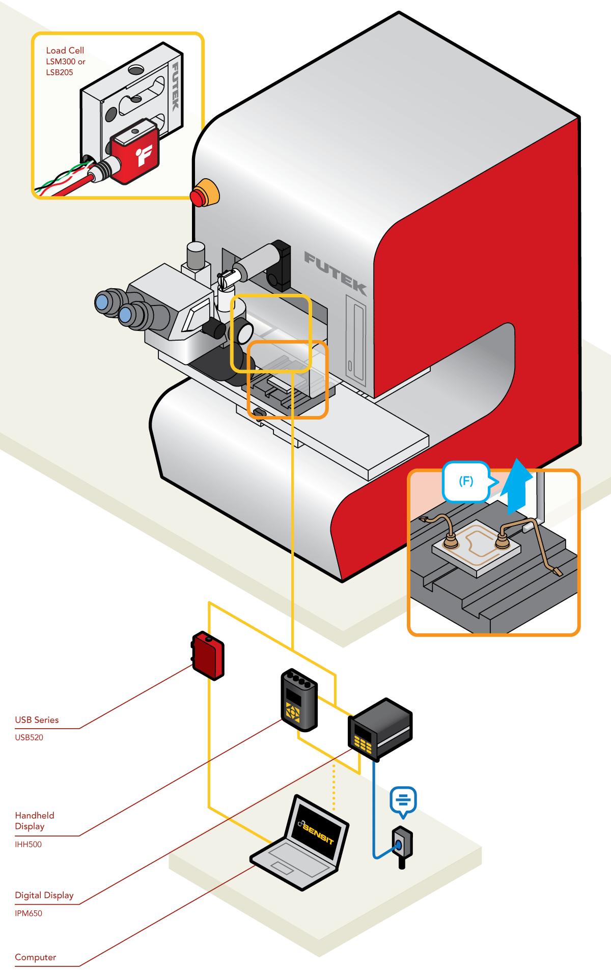 5、特别地,在拉丝测试中,FUTEK 的LSM300 精密测力元件或 LSB200 微型测力元件可以连接到钩形工具上,以测量被测导线受到的拉力。
