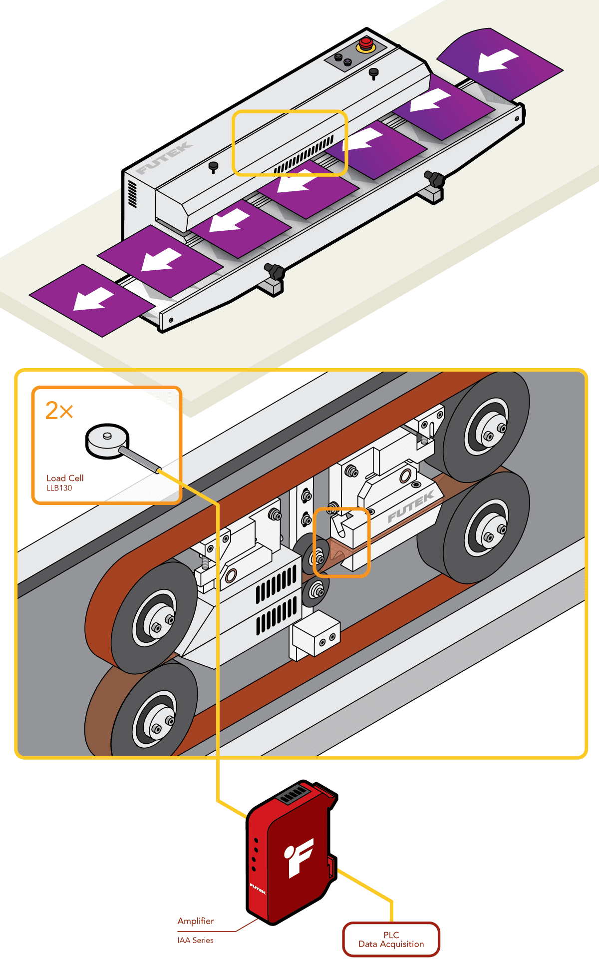 FUTEK超小型按钮测力传感器(LLB系列),搭配IAA系列模拟放大器与PLC进行通讯。