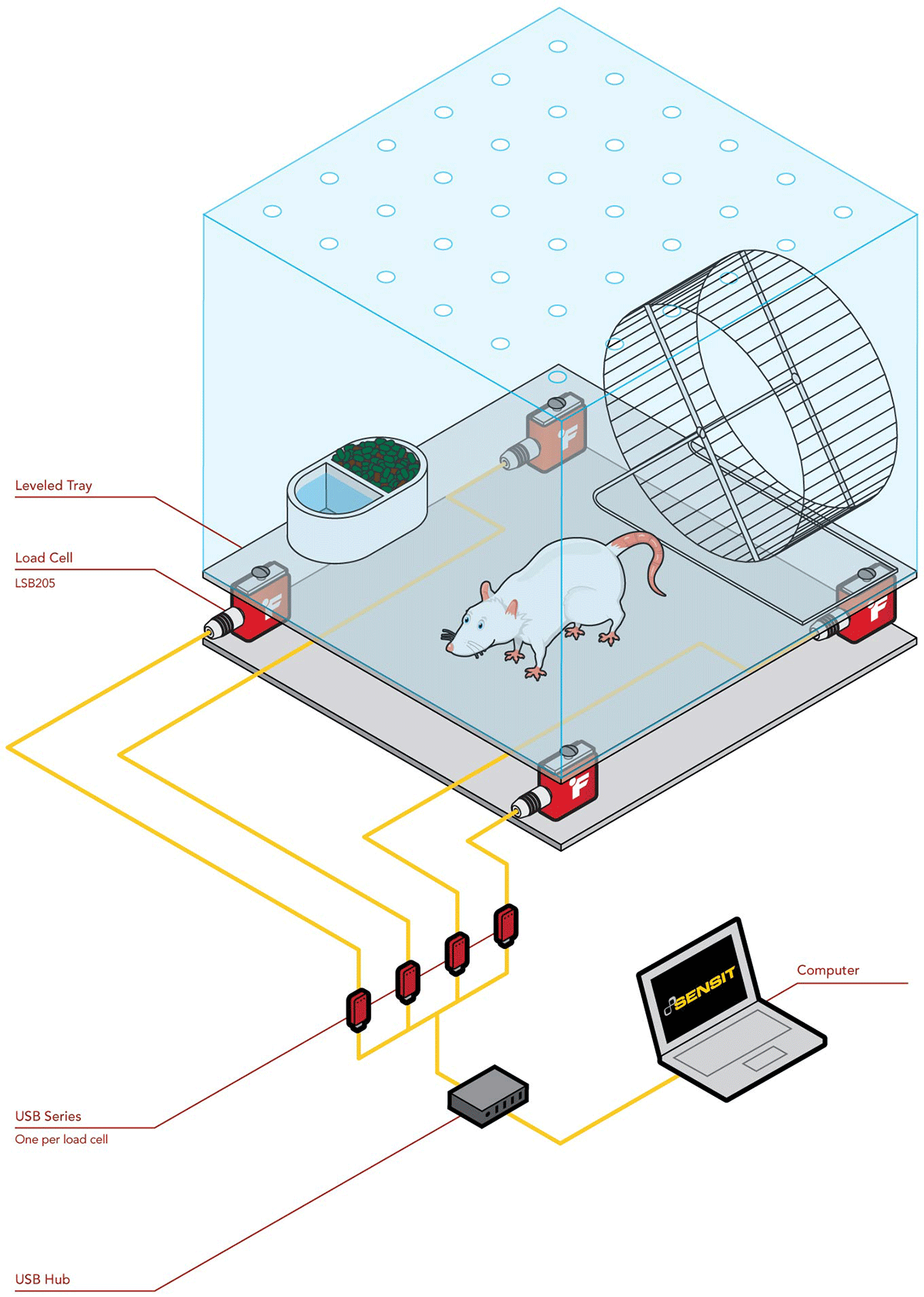 1、FUTEK LSB200传感器安装在白鼠笼子的四角,对白鼠的行为路径进行测试。