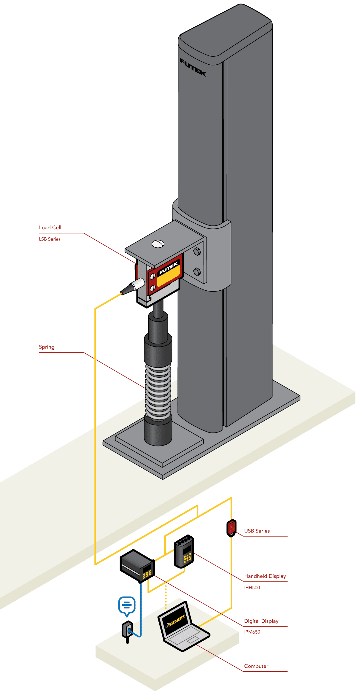 2、LSB 系列测力传感器固定在弹簧试验柱上,用于测量弹簧受压或伸长时的弹簧压缩力或拉力。
