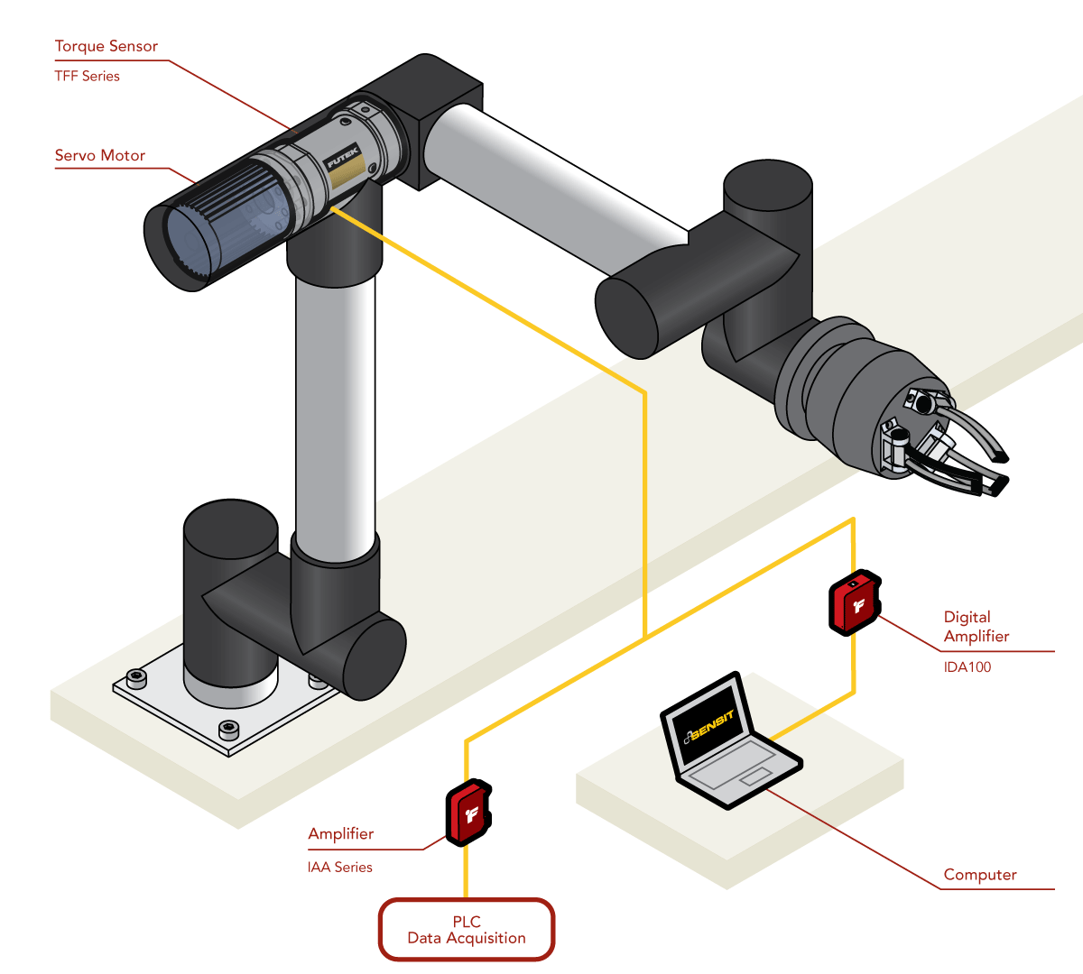 1、把TFF系列的静态扭力传感器安装在机械臂驱动前端和机械臂连接点中间。