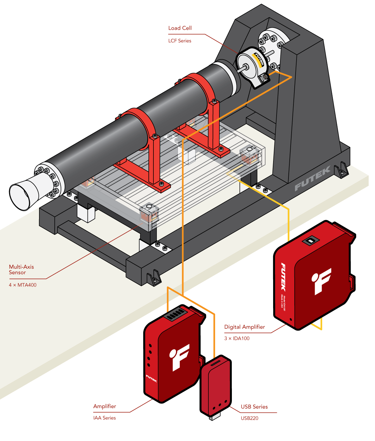 FUTEK通用的LCF系列传感器,搭配仪器仪表(IAA系列或USB220),4个FUTEK 的MTA400/MTA600多轴力传感器,每个多轴力传感器搭配3个IDA100数字放大器。