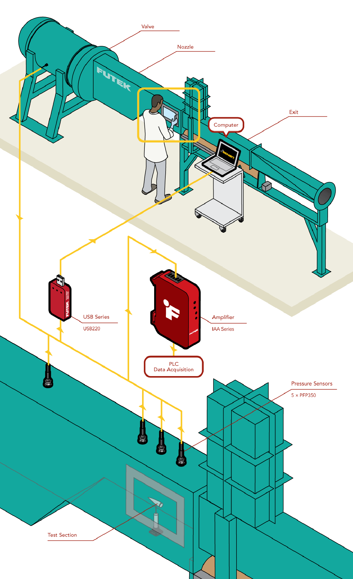 1、PFT510压力传感器安装在风洞中的临界点。在本例中,传感器安装在压力箱、喉管和测试区域的三个位置上。
