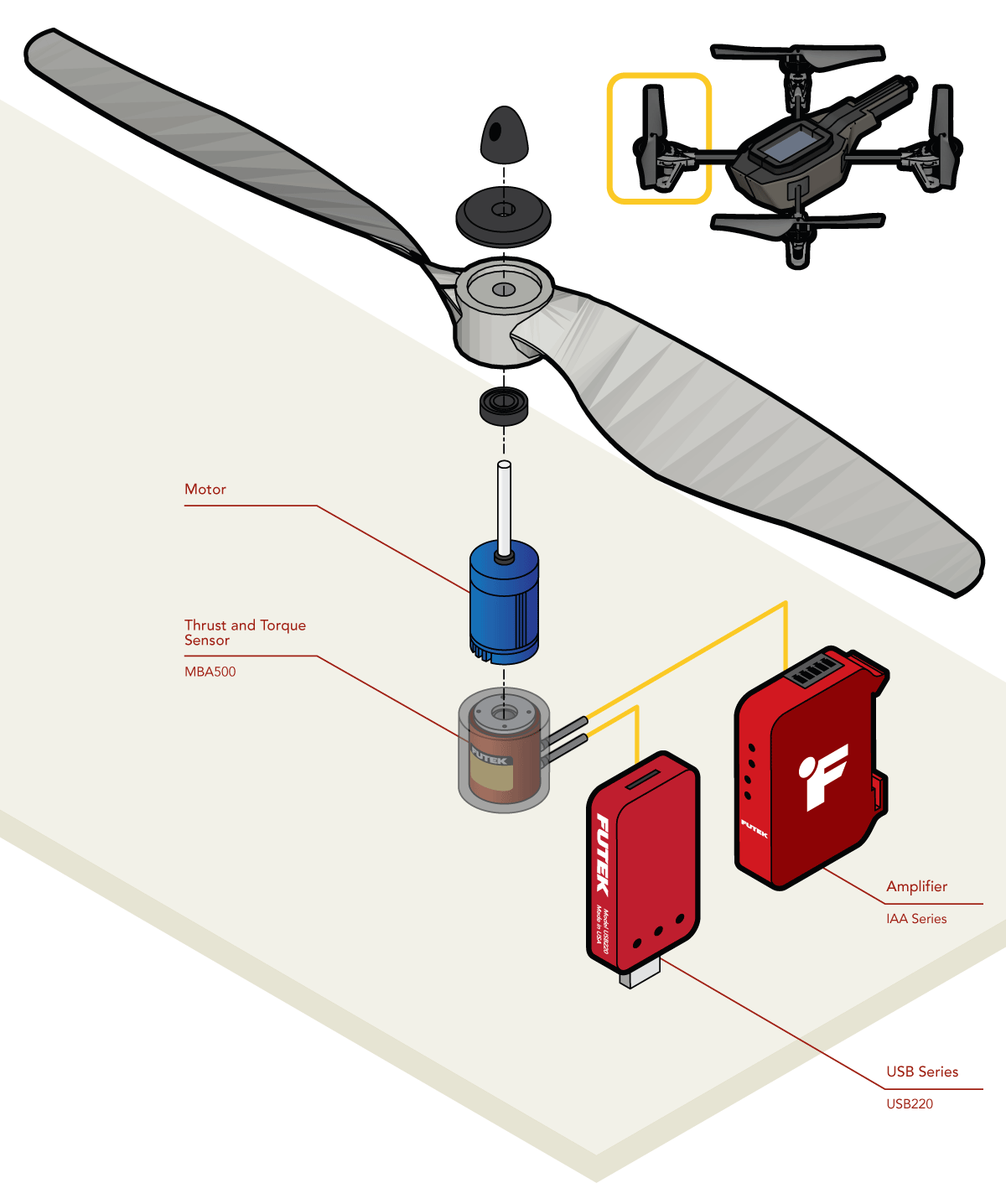 2、当马达驱动旋翼旋转时,传感器的Mz轴和Fz轴分别精确感应旋翼给机身带来的扭力及拉力。